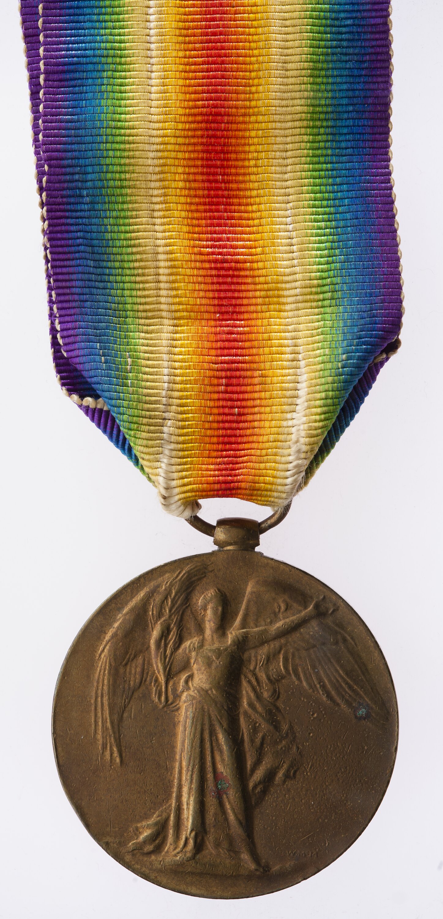 The Victory Medal was authorised in 1919 and was awarded to army, navy and air force personnel who served in a theatre of war between midnight 4th-5th August 1914 and midnight 11th-12th November 1918. The Allies resolved that, if they wished to issue a Victory Medal, it would share a common feature of a depiction of Victory on the obverse and a ribbon of red, yellow, green, blue and violet merged into a rainbow pattern. This medal, that of Great Britain, was awarded to personnel from countries in the British Empire (some 5,725,000 were issued). The other Allied countries that issued Victory medals were: Belgium, Brazil, Cuba, Czechoslovakia, France, Greece, Italy, Japan, Portugal, Romania, Thailand, Union of South Africa and the United States of America.