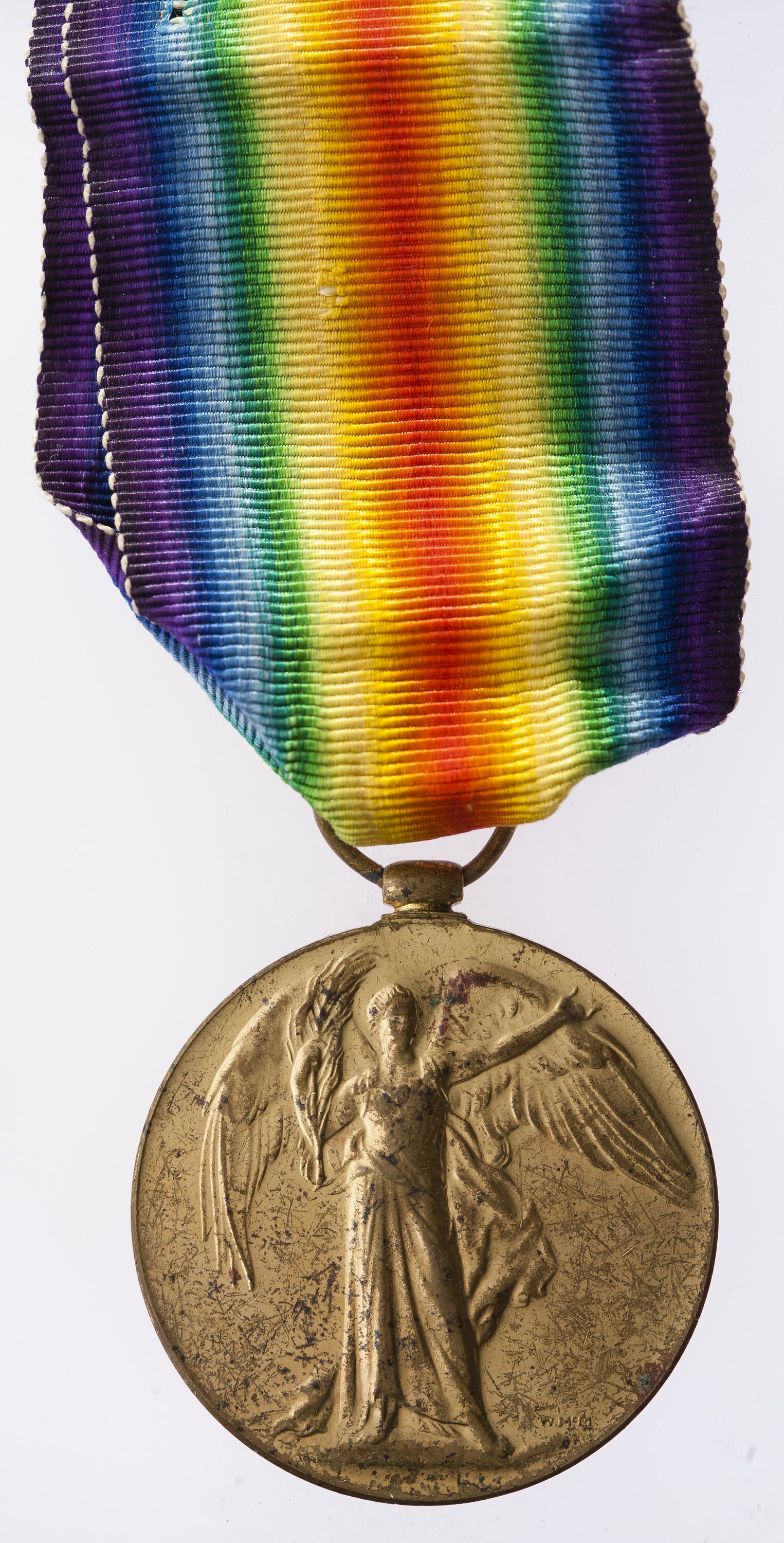 The Victory Medal was authorised in 1919 and was awarded to army, navy and air force personnel who served in a theatre of war between midnight 4th-5th August 1914 and midnight 11th-12th November 1918. The Allies resolved that, if they wished to issue a Victory Medal, it would share a common feature of a depiction of Victory on the obverse and a ribbon of red, yellow, green, blue and violet merged into a rainbow pattern. This medal, that of Great Britain, was awarded to personnel from countries in the British Empire (some 5,725,000 were issued). The other Allied countries that issued Victory medals were: Belgium, Brazil, Cuba, Czechoslovakia, France, Greece, Italy, Japan, Portugal, Romania, Thailand, Union of South Africa and the United States of America.