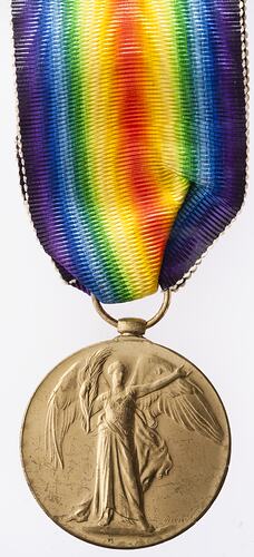 The Victory Medal was authorised in 1919 and was awarded to army, navy and air force personnel who served in a theatre of war between midnight 4th-5th August 1914 and midnight 11th-12th November 1918. The Allies resolved that, if they wished to issue a Victory Medal, it would share a common feature of a depiction of Victory on the obverse and a ribbon of red, yellow, green, blue and violet merged into a rainbow pattern. This medal, that of Great Britain, was awarded to personnel from countries in the British Empire (some 5,725,000 were issued). The other Allied countries that issued Victory medals were: Belgium, Brazil, Cuba, Czechoslovakia, France, Greece, Italy, Japan, Portugal, Romania, Thailand, Union of South Africa and the United States of America.