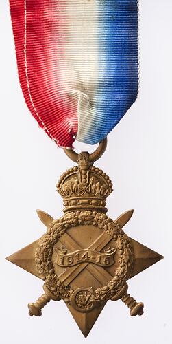 Four pointed star with the top point replaced by a crown with attached loop and ribbon, crossed swords project between the points of the star and at the centre, within an oak wreath, a scroll crossing the swords reads '1914-15'; at the base of the wreath is a large 'G' which encloses a 'V' (King George V).
