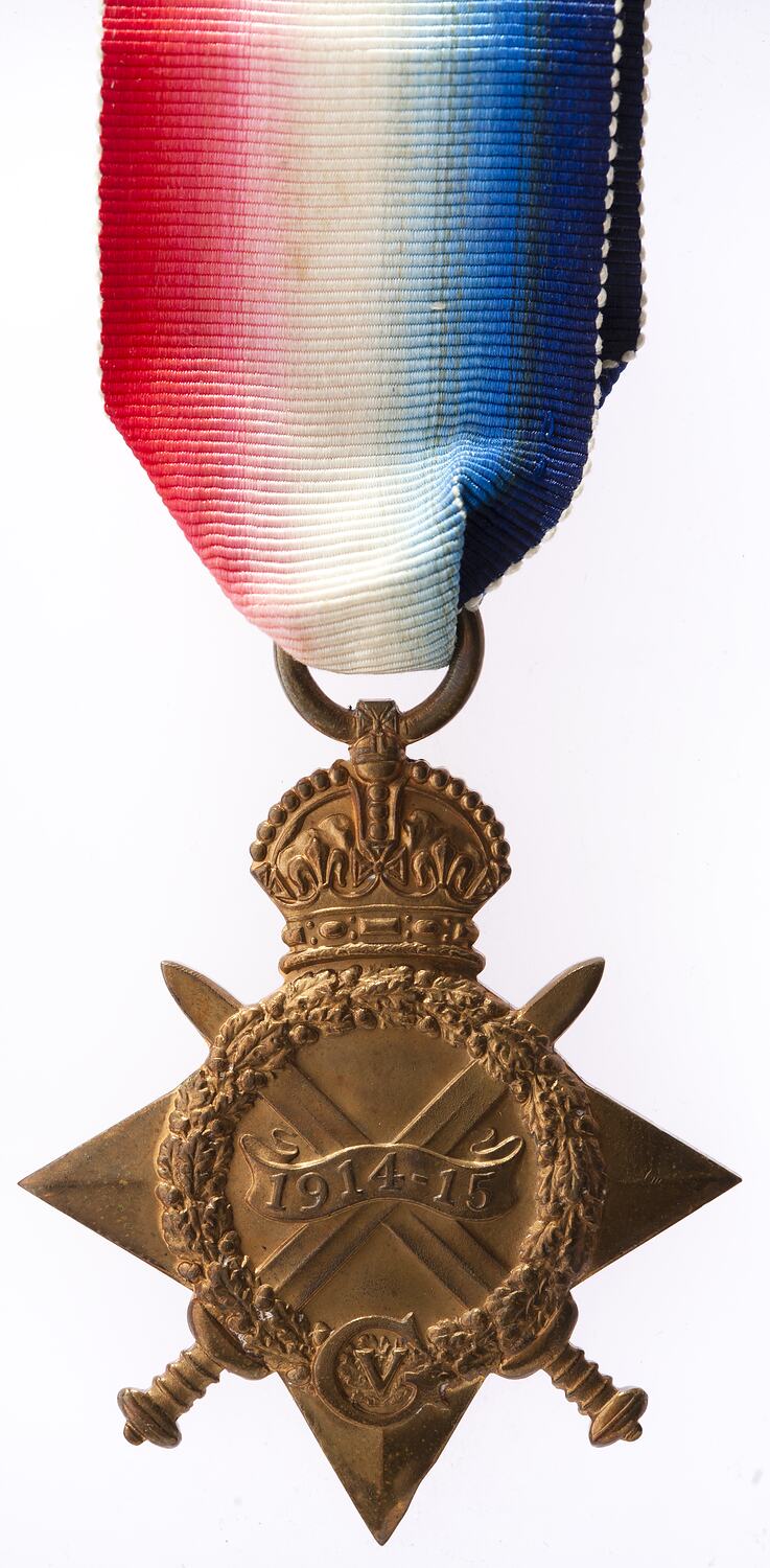 Four pointed star with the top point replaced by a crown with attached loop and ribbon, crossed swords project between the points of the star and at the centre, within an oak wreath, a scroll crossing the swords reads '1914-15'; at the base of the wreath is a large 'G' which encloses a 'V' (King George V).
