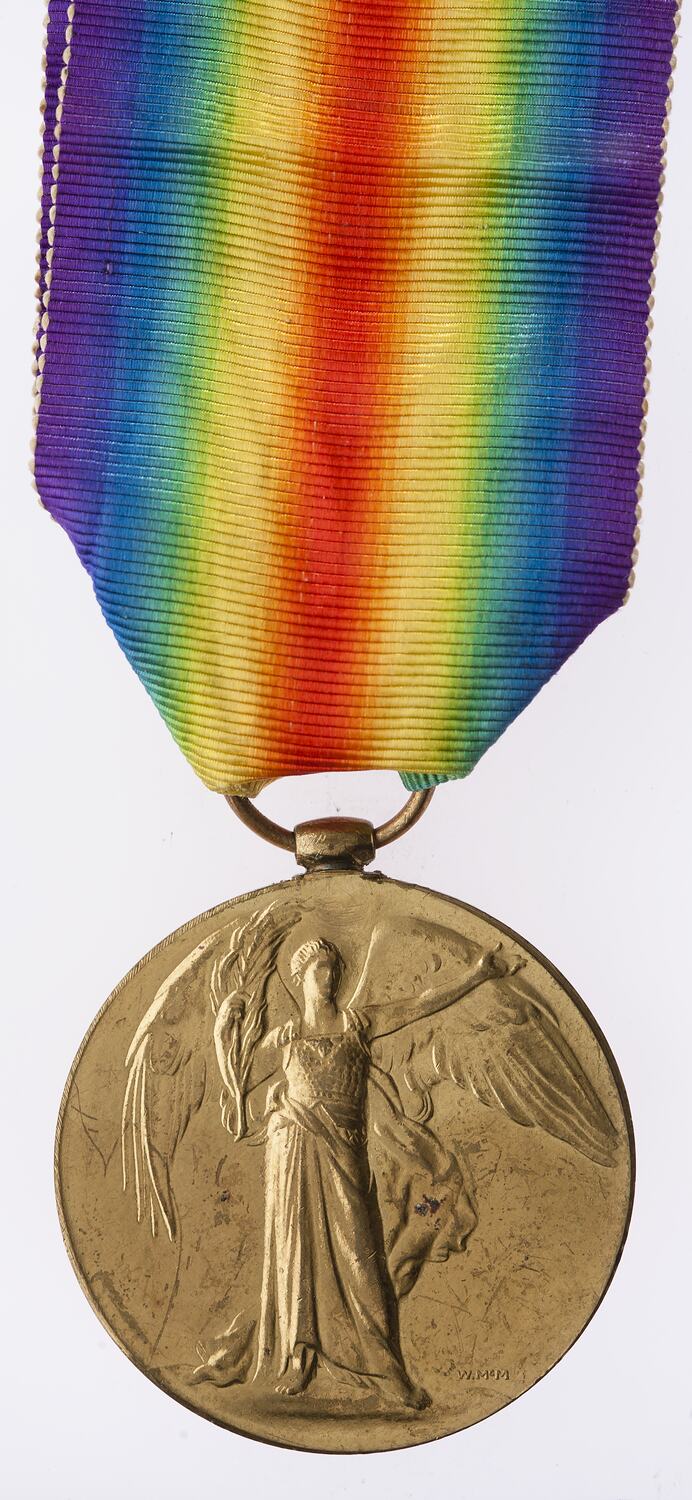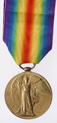 The Victory Medal was authorised in 1919 and was awarded to army, navy and air force personnel who served in a theatre of war between midnight 4th-5th August 1914 and midnight 11th-12th November 1918. The Allies resolved that, if they wished to issue a Victory Medal, it would share a common feature of a depiction of Victory on the obverse and a ribbon of red, yellow, green, blue and violet merged into a rainbow pattern. This medal, that of Great Britain, was awarded to personnel from countries in the British Empire (some 5,725,000 were issued). The other Allied countries that issued Victory medals were: Belgium, Brazil, Cuba, Czechoslovakia, France, Greece, Italy, Japan, Portugal, Romania, Thailand, Union of South Africa and the United States of America.