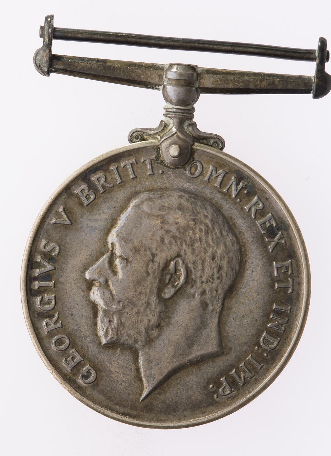 Bare head of King George V facing left; text around, 'GEORGIVS V BRITT: OMN: REX ET IND: IMP:'; the artist's initials 'B.M.' (Bertram MacKennal) are on the neck truncation.
