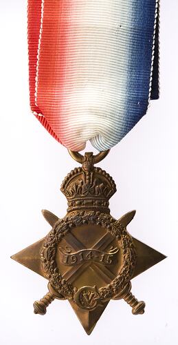 Four pointed star with the top point replaced by a crown with attached loop and ribbon, crossed swords project between the points of the star and at the centre, within an oak wreath, a scroll crossing the swords reads '1914-15'; at the base of the wreath is a large 'G' which encloses a 'V' (King George V).
