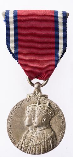 A silver medal with attached loop and ribbon. The obverse features conjoined half-length busts of King George V and Queen Mary wearing crowns and robes of state; around, GEORGE . V . AND . QUEEN . MARY . MAY . VI . MCMXXXV. The reverse has a crowned monogram GRI (Translation - George King and Emperor) with the dates of his reign at either side, MAY 6 1910 May 6 1935.