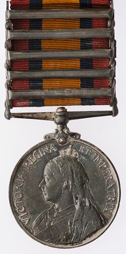 A silver medal (36mm diameter) with ribbon and six bars: CAPE COLONY, ORANGE FREE STATE, TRANSVAAL, SOUTH AFRICA 1901 and SOUTH AFRICA 1902. The obverse features a veiled and crowned half-length bust of Queen Victoria facing left; around, VICTORIA REGINA ET IMPERATRIX, the artist's name, G.W. de Saulles, is incuse on the base of the bust. The reverse depicts Britannia advancing facing right towards a column of marching soldiers, her trident, shield and a palm branch are on the ground behind her; in her left arm she holds a flag and with her right arm extends an laurel wreath towards the column, the fleet is at anchor in the background; around above, SOUTH AFRICA. The edge is impressed: 1491 SERJT. O.W. BIRCH VICTORIAN M.R.