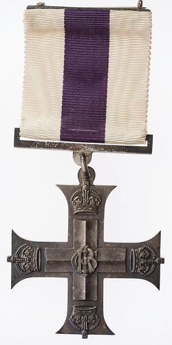 Silver cross with arms terminating in broad finials decorated with imperial crowns suspended by a loop to a plain suspension bar and white ribbon with broad central purple stripe with silver bar decorated with imperial crown. At the centre of the cross, the Royal cypher GRI (George King and Emperor).