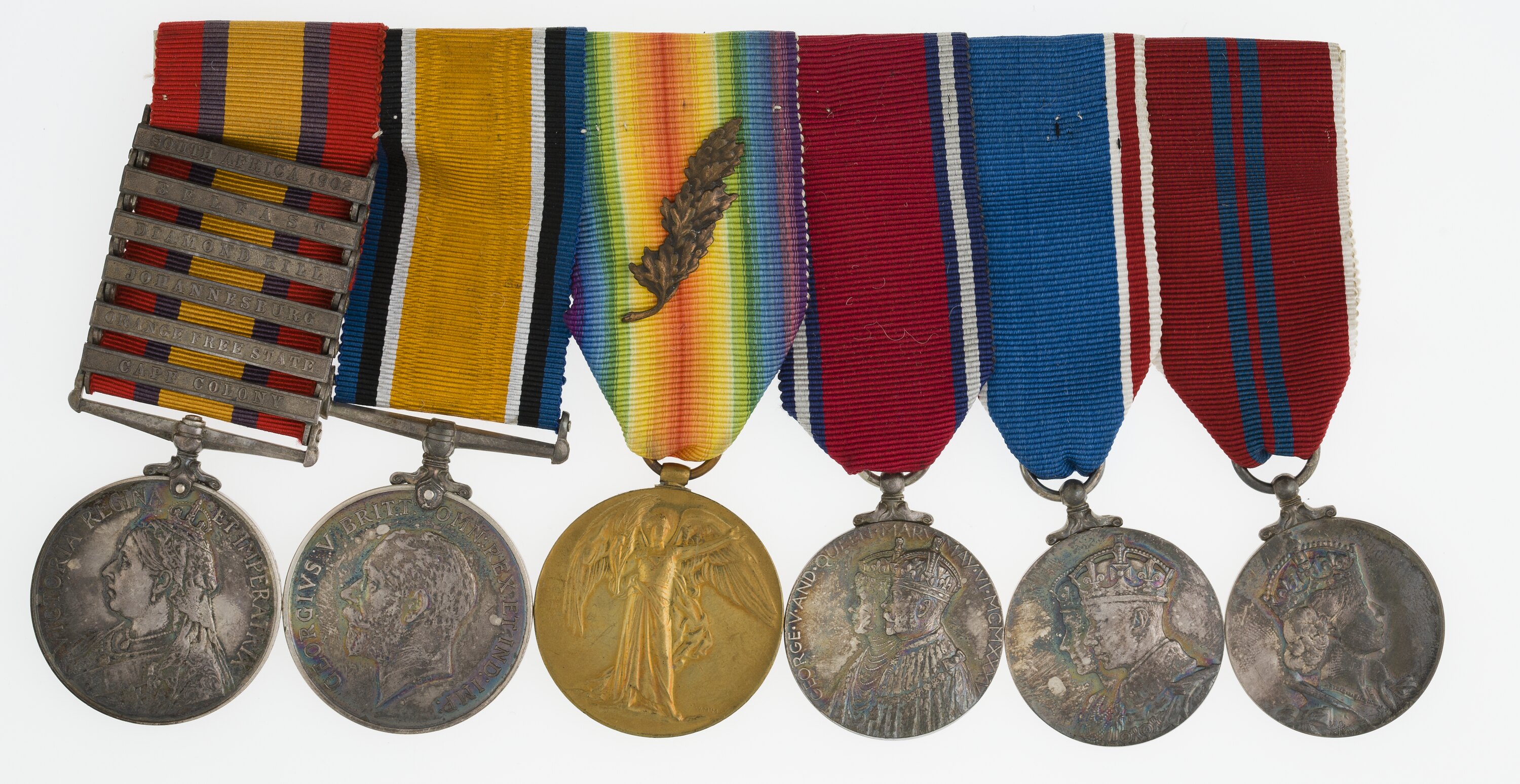 The group consists of: Queen's South Africa with 6 bars; British War Medal 1914 - 1920, Victory Medal with mention in dispatch oak leaf, George V Silver Jubilee Medal, George VI Coronation Medal and Elizabeth II Coronation Medal.