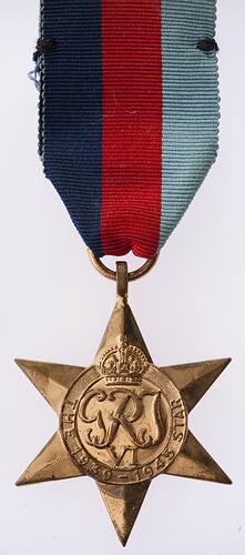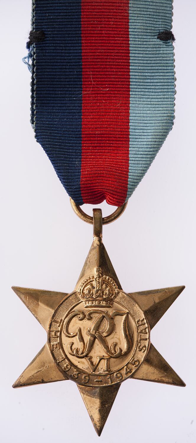 A six pointed bronze star with loop and attached ribbon from top. The obverse features, below a crown, the Royal cypher GRI above VI (Translation- George VI King and Emperor); around THE 1939 - 1945 STAR. The bar BATTLE OF BRITAIN, is sewn to the ribbon. The reverse is Impressed VX 37858 R.D. GRIST