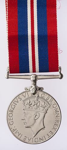 A cupro-nickel medal with mount and ribbon. The obverse features a crowned head of King George VI facing left; around, GEORGIVS VI D: G: BR: OMN: REX F: D: IND: IMP: (Translation - George VI by the Grace of God King of all the British, Defender of the Faith, Emperor of India); the artist's initials H.P. (T.H. Paget) in the field below the neck. The reverse depicts a lion standing facing left on a fallen two-headed dragon; in field above lion, 1939 1945; the artist's initials E.CR.P. (A. Carter Preston) in field to left of lion. The edge is impressed: V16171 J.L. GABORIT