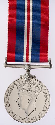 A cupro-nickel medal with mount and ribbon. The obverse features a crowned head of King George VI facing left; around, GEORGIVS VI D: G: BR: OMN: REX F: D: IND: IMP: (Translation - George VI by the Grace of God King of all the British, Defender of the Faith, Emperor of India); the artist's initials H.P. (T.H. Paget) in the field below the neck. The reverse depicts a lion standing facing left on a fallen two-headed dragon; in field above lion, 1939 1945; the artist's initials E.CR.P. (A. Carter Preston) in field to left of lion. The edge is impressed: VX74401 R.C. PATERSON