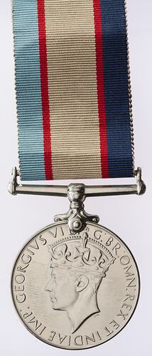 A nickel-silver medal with ribbon. The obverse features a crowned head of King Geirge VI facing left with the artist's initials PM in the field below the neck; around, GEORGIVS VI G: BR: OMN: REX ET INDIAE IMP: The reverse has the Australian Coat of Arms; around above, THE AUSTRALIA SERVICE MEDAL; below, 1939 - 1945. The edge is impressed in capitals: VX 18392 W.J. CHANNON