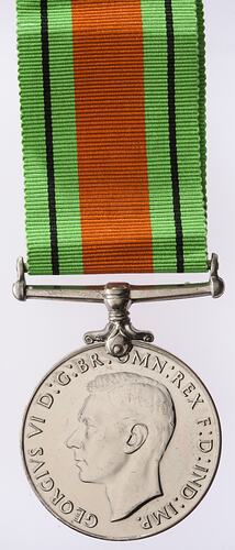 A cupro-nickel medal with mount and ribbon. The obverse features a bare head of King George VI facing left; around, GEORGIVS VI D: G: BR: OMN: REX F: D: IND: IMP: (Translation - George VI by the Grace of God King of all the British, Defender of the Faith, Emperor of India); the artist's initials H.P. (T.H. Paget) in the field below the neck. The reverse depicts a Royal Crown above a small oak tree growing on land surrounded by water, with two lions as supporters; around, 1939 1945; in exergue, THE DEFENCE MEDAL; the artist's monogram HWP (H. Wilson Parker) among the roots of the tree. The edge is impressed: VX 37047 S.E. HAYES