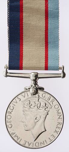 A nickel-silver medal with ribbon. The obverse features a crowned head of King Geirge VI facing left with the artist's initials PM in the field below the neck; around, GEORGIVS VI G: BR: OMN: REX ET INDIAE IMP: The reverse has the Australian Coat of Arms; around above, THE AUSTRALIA SERVICE MEDAL; below, 1939 - 1945. The edge is impressed in capitals: VX 37047 S.E. HAYES