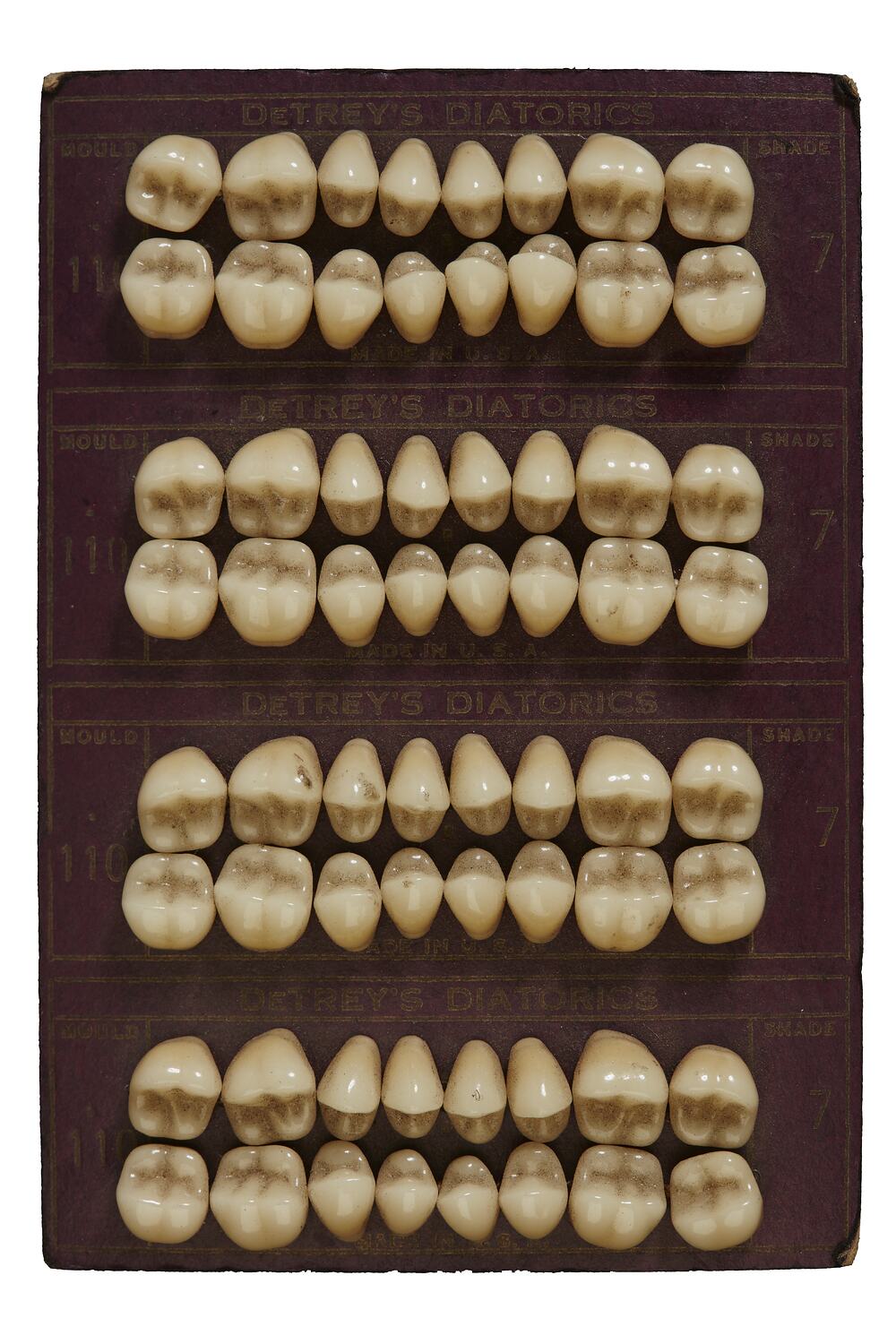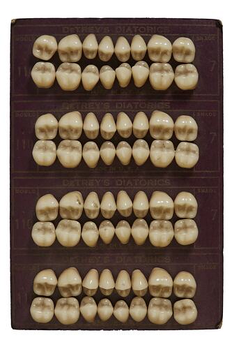Set of porcelain teeth for dentures, comprising cuspids and molars. Mould 110 and Shade 7. Made by DeTrey's Diatorics for the Amalgamated Dental Co. Limited, London, England, circa 1925. Used in the mental health hospital Lakeside Hospital, Ballarat, Victoria, Australia.