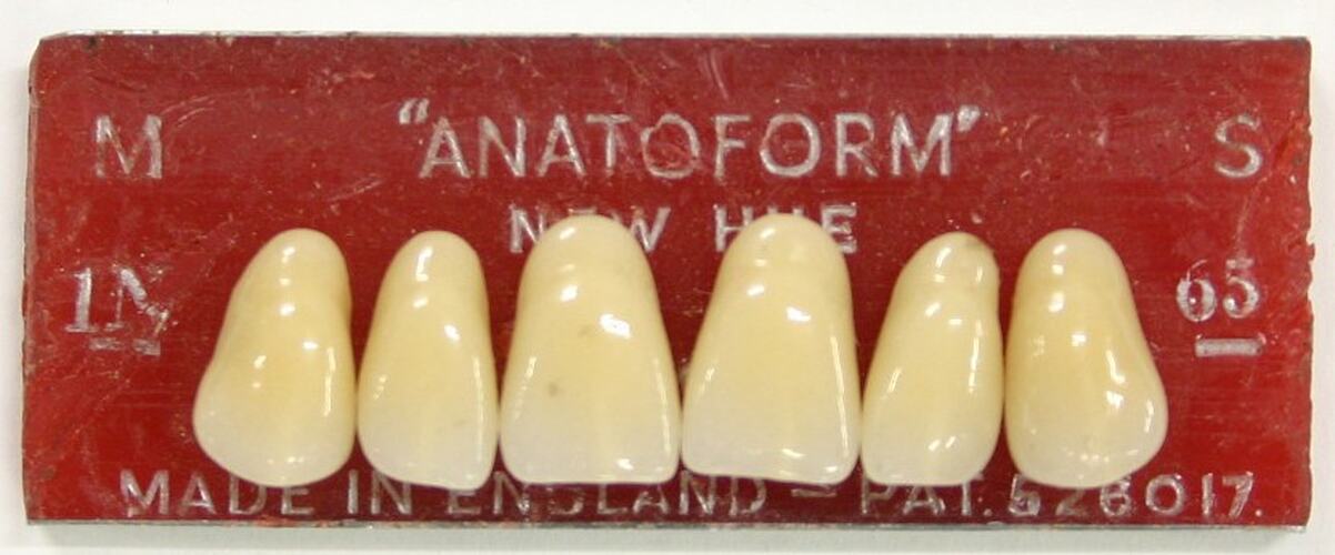 Set of six porcelain incisor teeth for dentures, Anatoform brand, made circa 1925. Distributed by the Amalgamated Dental Trade Distributors Ltd, London. Used in the Lakeside Hospital, Ballarat, Victoria, Australia