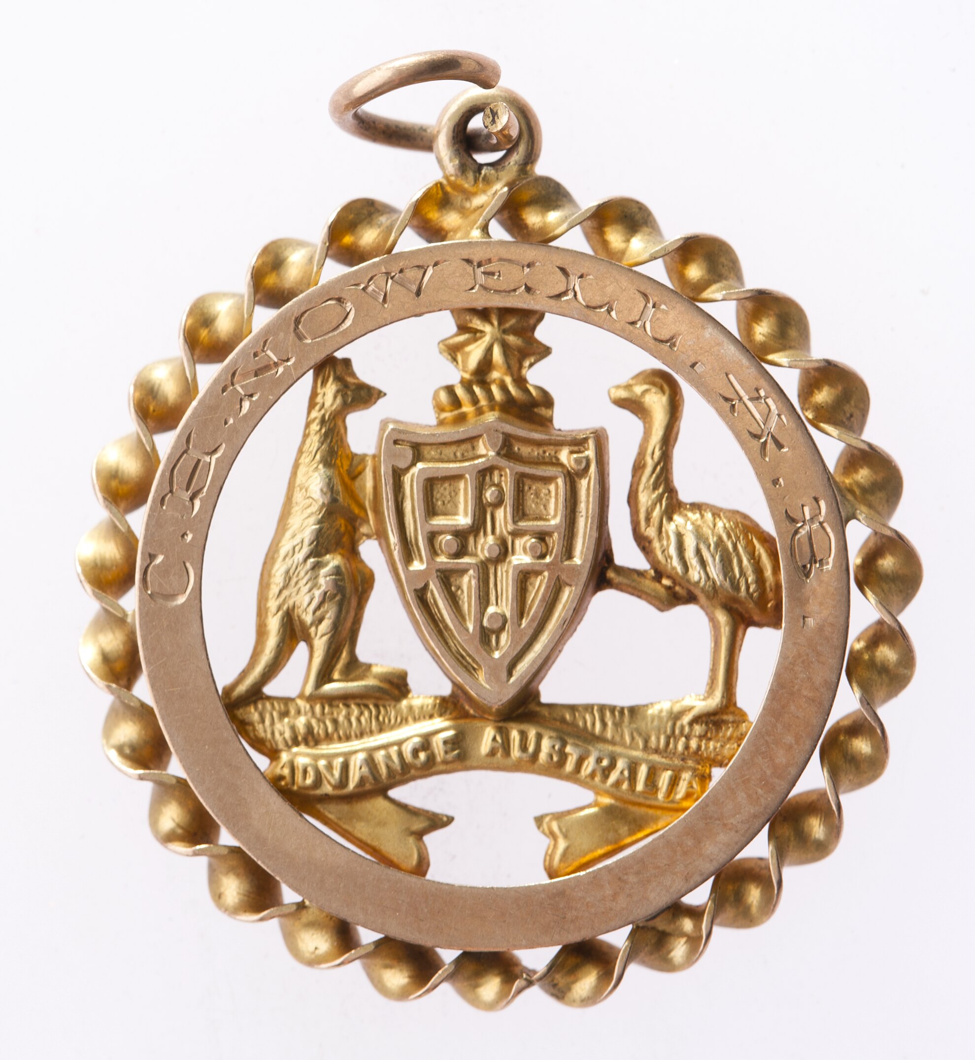 A circular skeletal gold badge featuring the Australian Coat of Arms; around on border incuse, C.H.NOWELL A.B.