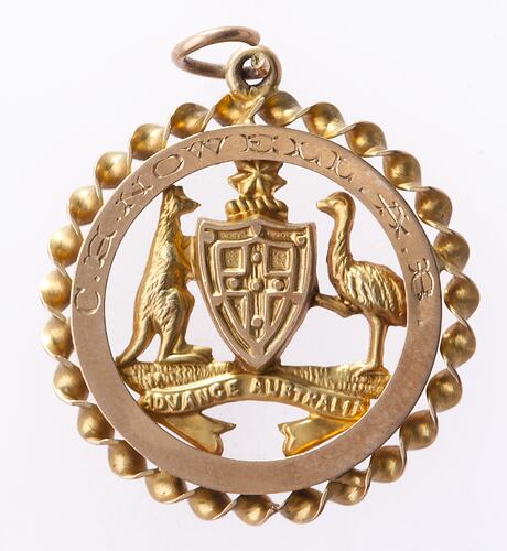 A circular skeletal gold badge featuring the Australian Coat of Arms; inscription on border incuse. Loop and splirt ring at top.