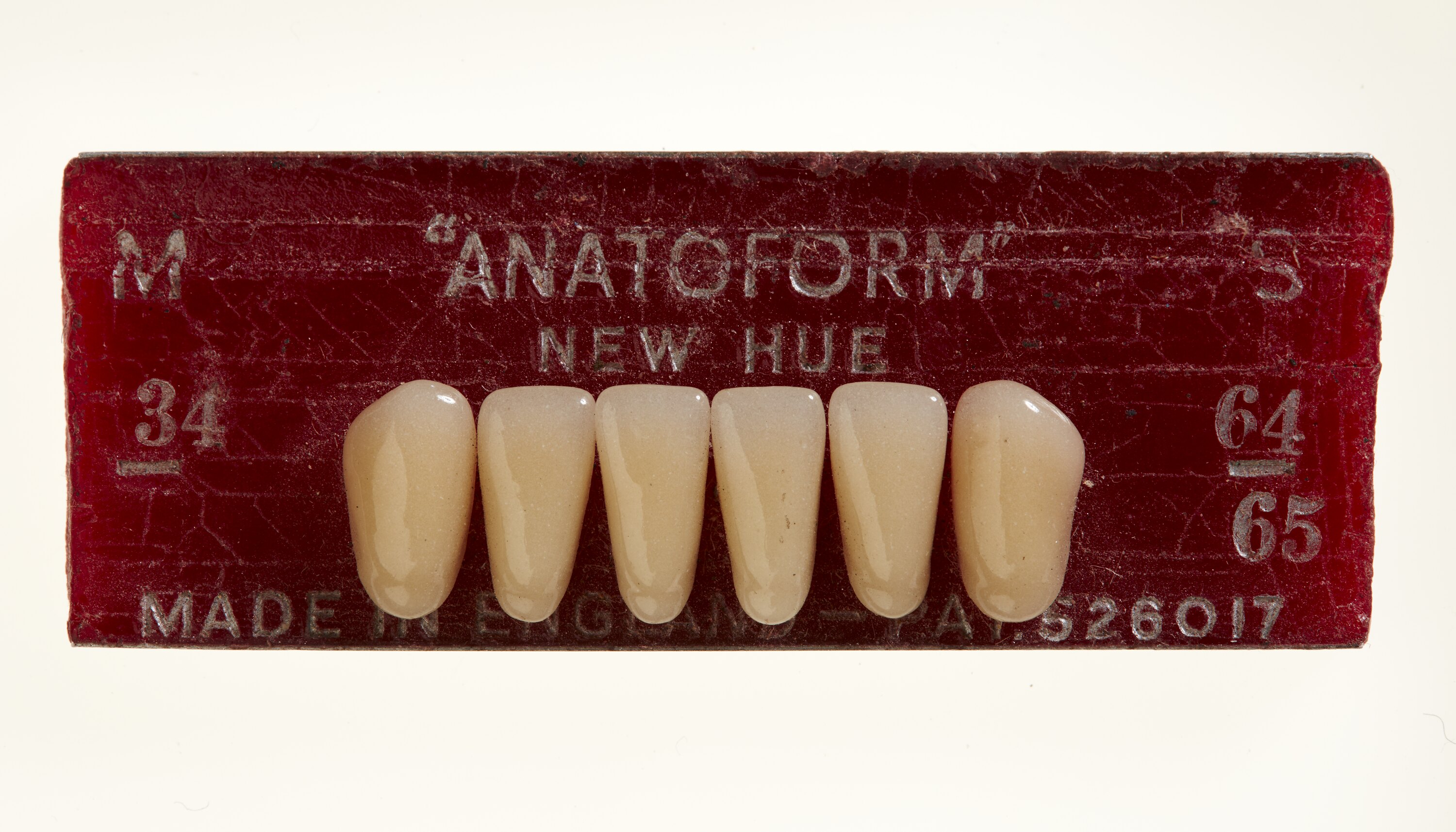 Front: 'ANATOFORM / NEW HUE / MADE IN ENGLAND - PAT 526017 / M / 34 / S / 64 / 65'. Reverse: 'AMALGAMATED DENTAL / TRADE DISTRIBUTORS LTD / LONDON W.I.'.