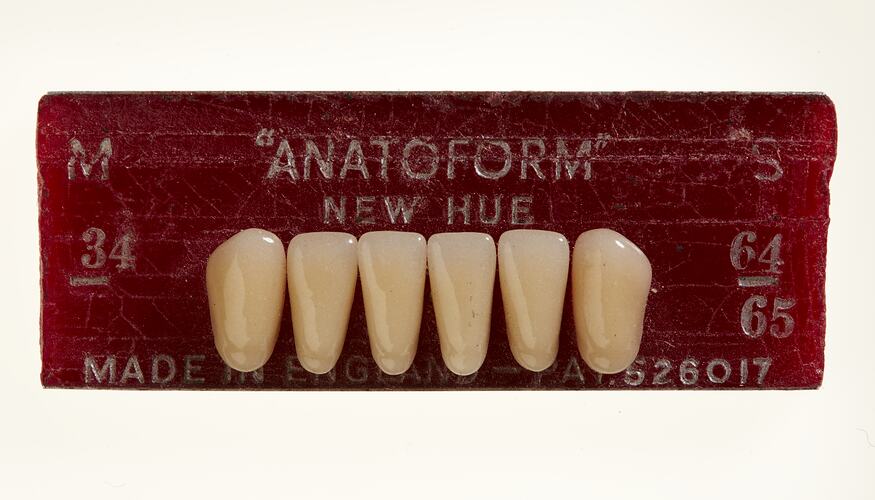 Set of six porcelain incisor teeth for dentures, Anatoform brand, made circa 1925. Patent 526017. Distributed by the Amalgamated Dental Trade Distributors Ltd, London. Used in the Lakeside Hospital, Ballarat, Victoria, Australia.