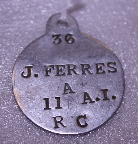 Aluminium identity tag that belonged to Private Joseph Ferres of the 11th Battalion, World War I. He was a 29 year old farmer/labourer when he joined the AIF on 26 August 1914. Born in Malta on 15 December 1884, he was living in Perth at the time of enlistment and embarked from Fremantle on 2 November 1914. He served in Gallipoli and France. His regimental number was 36. He was wounded several times, including a wound in the forehead and thumb at Gallipoli on (or about) 25 April 1915 and wounds to the head, collarbone and arm in France in July 1916. He also became ill from venereal disease, influenza and conjunctivitis during his period of service. He was discharged on 13 February 1917.