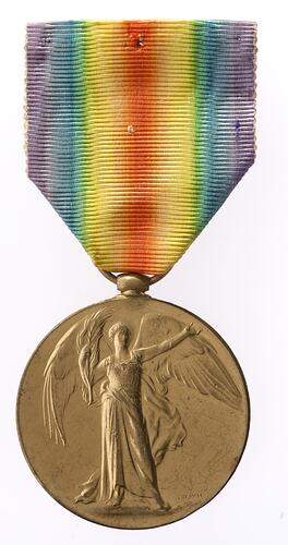 The South African Victory Medal (with reverse legend in English and Afrikaans) was authorised in 1919 and was awarded to army, navy and air force personnel who served in a theatre of war between midnight 4th-5th August 1914 and midnight 11th-12th November 1918. The Allies resolved that, if they wished to issue a Victory Medal, it would share a common feature of a depiction of Victory on the obverse and a ribbon of red, yellow, green, blue and violet merged into a rainbow pattern. The other Allied countries that issued Victory medals were: Belgium, Brazil, Cuba, Czechoslovakia, France, Great Britain, Greece, Italy, Japan, Portugal, Romania, Thailand and the United States of America.