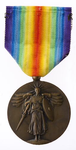 The Allies resolved that, if they wished to issue a Victory Medal, it would share a common feature of a depiction of Victory on the obverse and a ribbon of red, yellow, green, blue and violet merged into a rainbow pattern. The other Allied countries that issued Victory medals were: Belgium, Brazil, Cuba, Czechoslovakia, France, Great Britain, Greece, Italy, Japan, Portugal, Romania, Thailand, and the Union of South Africa.
