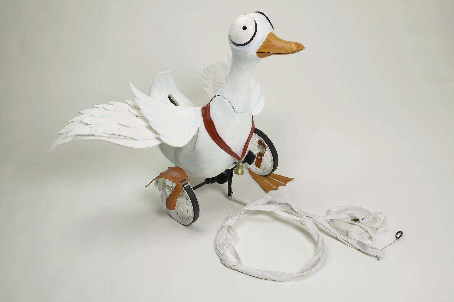 White duck puppet with a red collar and a bell. Puppet moves on three wheels, two at the front and one at the back. Duck is made from fibreglass-coated polystyrene, over a wooden frame. Wings made of white painted polyethelyene foam Wire attached to the front of the puppet, concealed in white fabric, was used to release its wings. Attached to this wire is a long white tape.