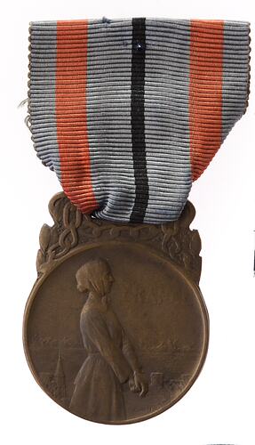 The medal was instituted by the Minister of Liberated Regions on 30 June 1921 in 3 classes (silver-gilt, silver and bronze) and awarded to those who had been rendered homeless or otherwise endured suffering resulting from the German invasion between 1914 to 1918. A bar "Prisonniers Politiques" or "Otages de Guerre" ("Political Prisoners" and "War Hostages") could be worn on the ribbon.