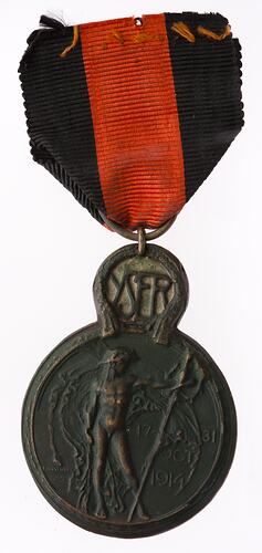 Medal surmounted by a smaller green enamelled medallion. Obverse of main medal section has a naked helmeted soldier holding a lance beside the dates "17 - 31 / OCT / 1914". The enamelled medallion reads "YSER".