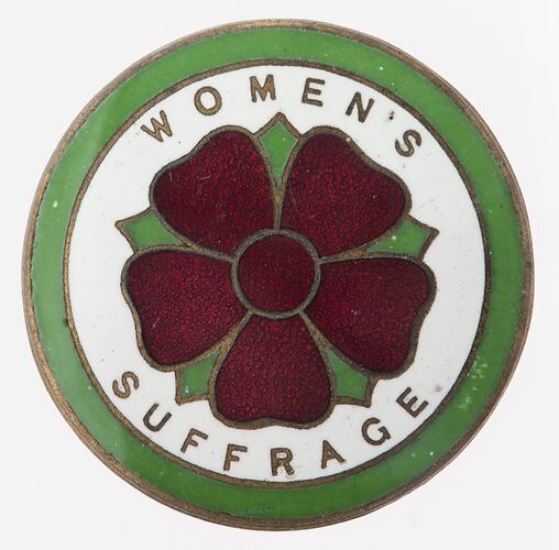 Badge with the slogan 'Women's Suffrage', it was issued and used in Great Britain, circa 1905. Militant activism for Women's suffrage began in Great Britain 1905 when Christabel Pankhurst and fellow suffragette Annie Kenney attended a Manchester public meeting. Despite persistently asking those politicians present if a Liberal Government would give women the vote, they were ignored before they were literally dragged away.