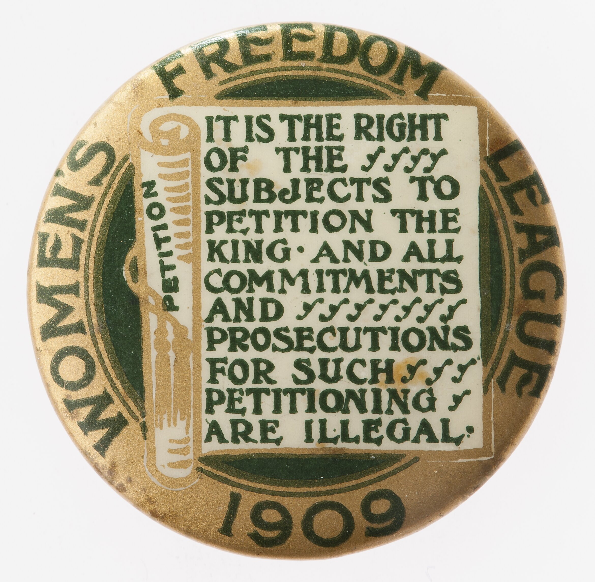 Women's Freedom League badge, Great Britain, 1909. The badge quotes from the English Bill of Rights 1689, referring to the subject's right to petition the monarch without adverse consequences.