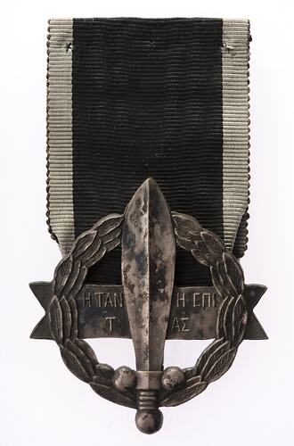 Medal consists of a vertical sword on a circular laurel wreath supported by a horizontal plaque bearing ancient Greek text.