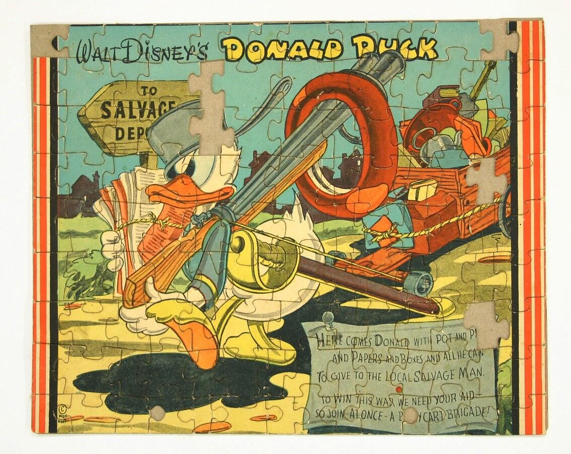 Small coloured jigsaw on thick cardboard, headed 'Walt Disney's Donald Duck / to the Salvage Department'. The images shows a heavily laden Donald Duck, carrying guns, a tyre, and a bundle of old newspapers, with a verse encouraging people to donate waste material to the war effort.