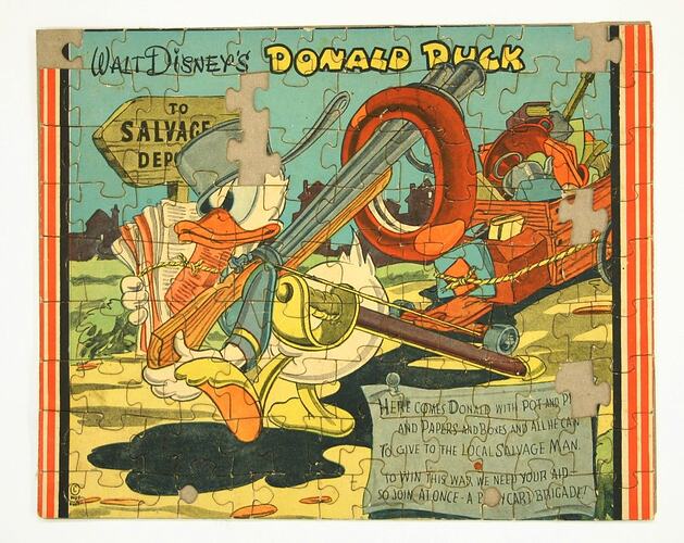 Small coloured jigsaw on thick cardboard, headed 'Walt Disney's Donald Duck / to the Salvage Department'. The images shows a heavily laden Donald Duck, carrying guns, a tyre, and a bundle of old newspapers, with a verse encouraging people to donate waste material to the war effort. The verse reads: 'Here comes Donald with pots and pans/ and paper and boxes and . /To give to the local salvage man/ To win the war we need your aid/ so join at once a [illeg] Brigade.' There are four pieces missing.