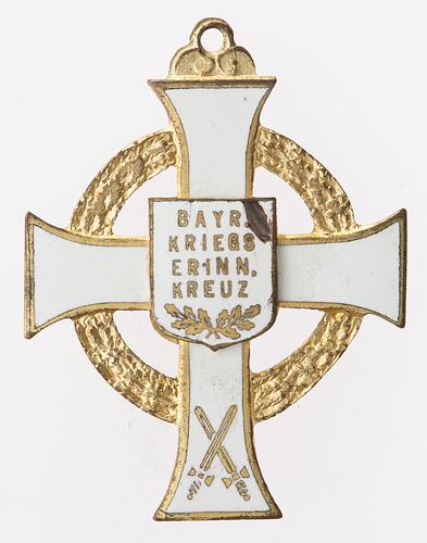 Gilt edged white enamel cross featuring gilt inscription, crossed oak leaves and crossed swords. Inscription reads 'BAYR. / KRIEGS / ERINN. / KREUZ' (abbreviation of Bayrisches Kriegserinnerungskreuz that translates to Bavarian War Commemorative Cross).