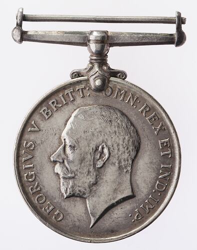 Obverse; 'GEORGIVS V BRITT: OMN: REX ET IND: IMP:'. 'B.M.' (Bertram MacKennal - artist). Reverse; '1914 1918'. Edge; '3831 CPL. J.G. GREEN. 5 BN. A.I.F.'.