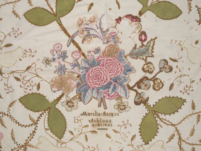Appliqué quilt, with floral and bird pattern on heavy off-white fabric. It was made by Martha Bergin in Athlone, Ireland, in 1843, perhaps for her glory box. She was born in 1822 at Rathdowney, Queens County (now County Laois), Ireland. Her father was a draper, which may explain the rich range of textiles which have been incorporated in the quilt and its strong base fabric. In 1846 she married Andrew Tipping who had been born in 1824 in Castletown, County Westmeath and was probably involved in land management and farming.
