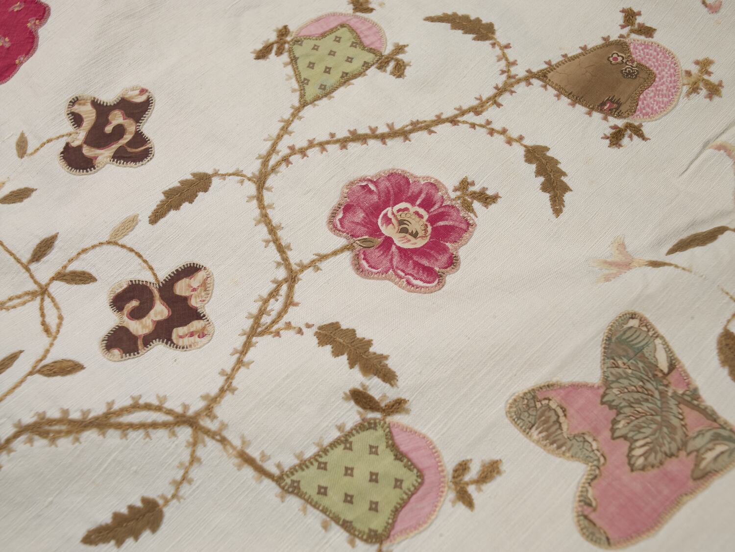 Appliqué quilt, with floral and bird pattern on heavy off-white fabric. Appliqué is made up of many different types of fabric, some printed with patterns such as flowers. A simple blanket-style stitch is used around the appliquéd pieces and to form stems between floral forms. Original fringe was trimmed back in recent decades to small woven trim; a relative also washed the quilt, which has caused slight bleeding to some colours.