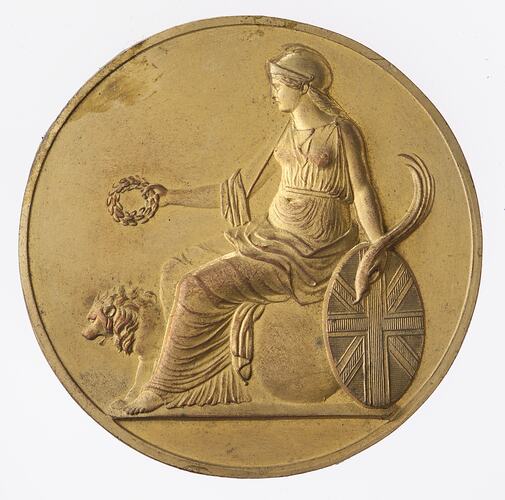 An electrotype copy of a Large Gold medal in two halves featuring on the obverse Britannia seated on a globe facing left wearing helmet; in her right hand she presents a laurel wreath and in her left a palm branch which she rests of a shield bearing the Union crosses, the forepart of a lion, advancing right, emerges from behind her.