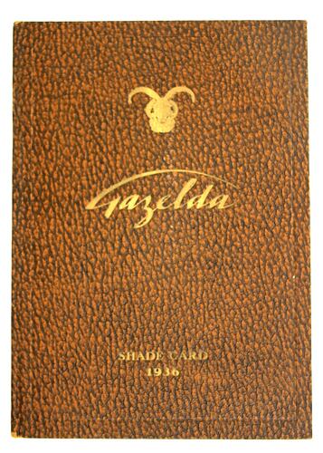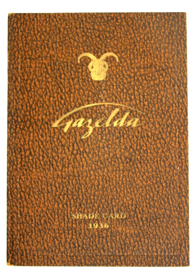 Shade Card with small coloured leather samples, printed and issued by Gazelda Ltd., Watford, England, 1936. Simpson's Gloves Pty. Ltd., Melbourne were the sole agents for Gazelda in Australia.
