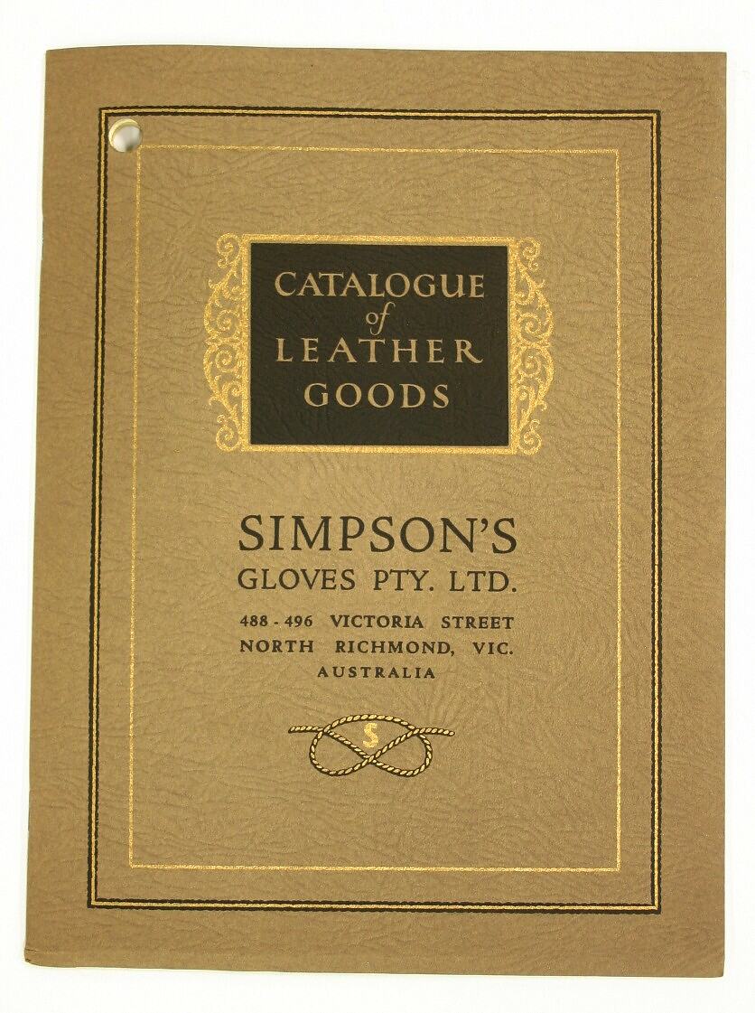 Front cover: 'CATALOGUE / of / LEATHER GOODS / SIMPSON'S / GLOVES PTY. LTD. / 488 - 496 VICTORIA STREET / NORTH RICHMOND, VIC. / AUSTRALIA' Text throughout.