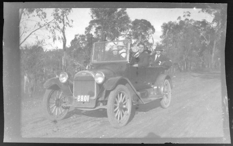 Group of men and women driving along a tree-lined, unpaved road in an open-top motor car. The car's licence plate reads- '1089.'