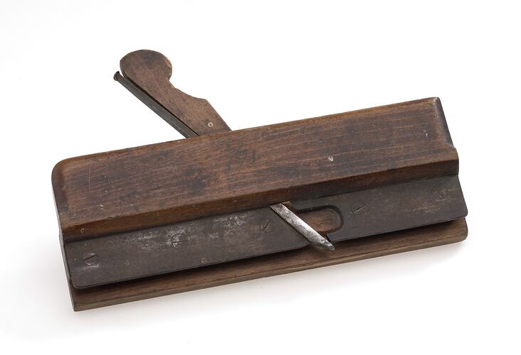 Wooden moulding plane. Designed to make a rounded "quirk" or "side bead" along the edge of a piece of timber, for example when making lining boards. Once owned by Joseph Stevenson, reputed to have built the first wooden house in Melbourne and the first public punt to operate on the Yarra River, for publican William Watts, near the site of the present Princes Bridge. He was also involved in the construction of Kirk's Horse Bazaar in Bourke Street and other early Melbourne buildings. Joseph Stevenson later settled at Kangaroo Ground in the 1840s.