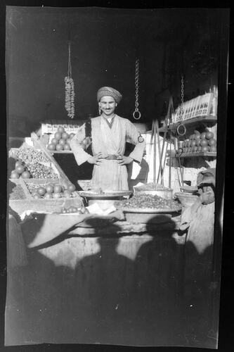 Black and white photographic negative, dating from World War I, showing a Middle Eastern man standing behind his food stall.