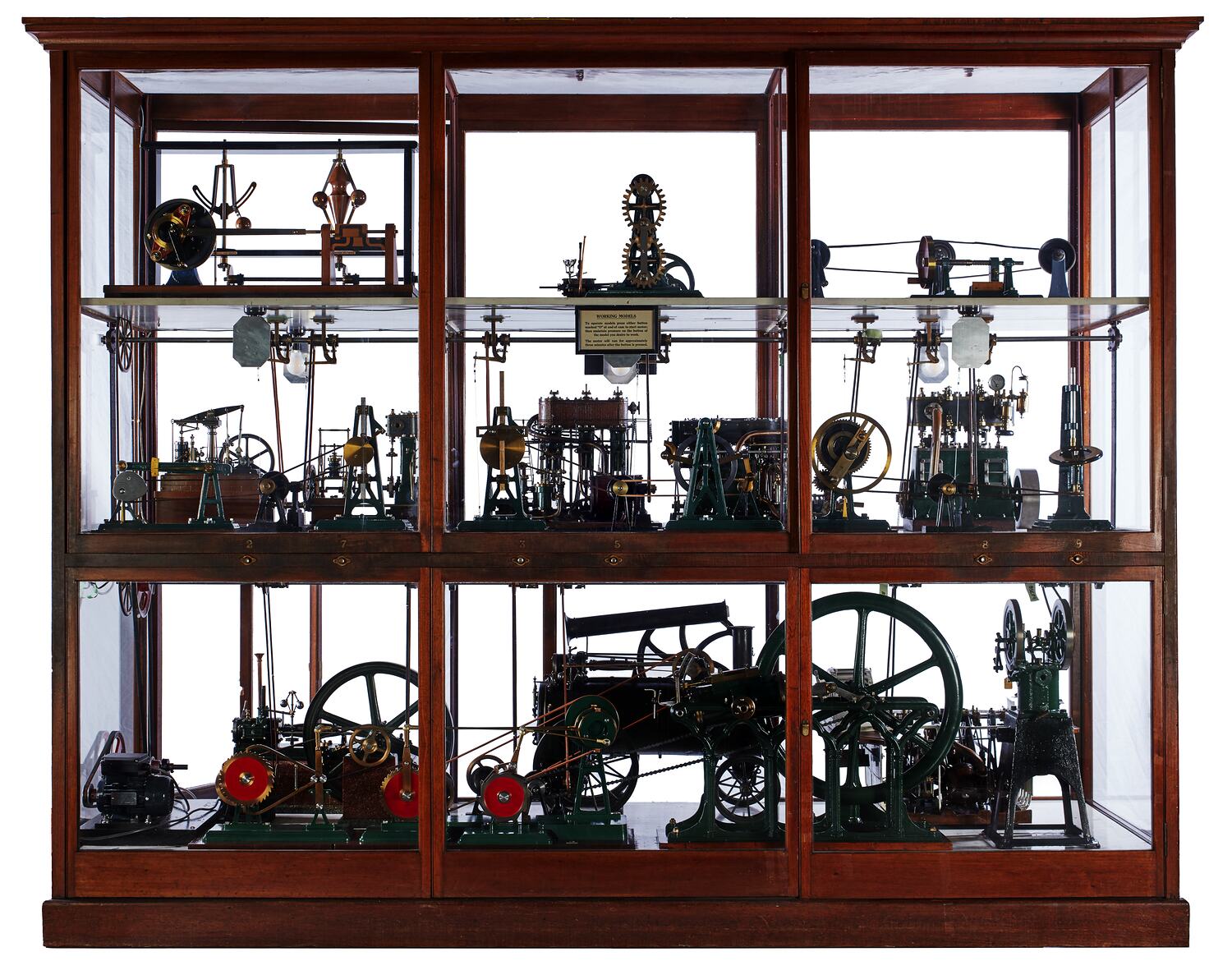 The models themselves have interesting origins. The oldest being a portable steam engine and a horizontal stationary engine, both made by Ransomes & Sims of Ipswich, England, in 1859, as fully steamable models, depicting the firm's full-size products. Another 14 models depicting governors, ratchets and other mechanisms were part of a group of 120 models that the Industrial and Technological Museum ordered from the scientific model maker G. Cussons, of Manchester in 1915.