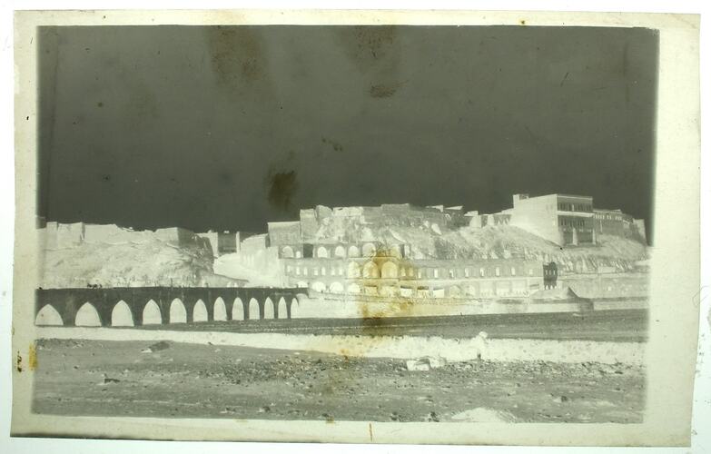 Black and white photographic negative, dating from the First World War, showing a view of the ruins of a city in the Middle East.