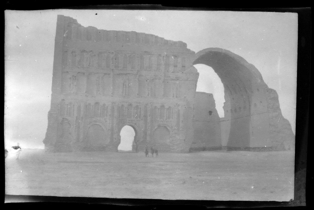 Black and white negative dating from World War I, showing a black and white photograph of the Arch of Etesiphon (Ctesiphon) in Iraq, part of a ruined palace.