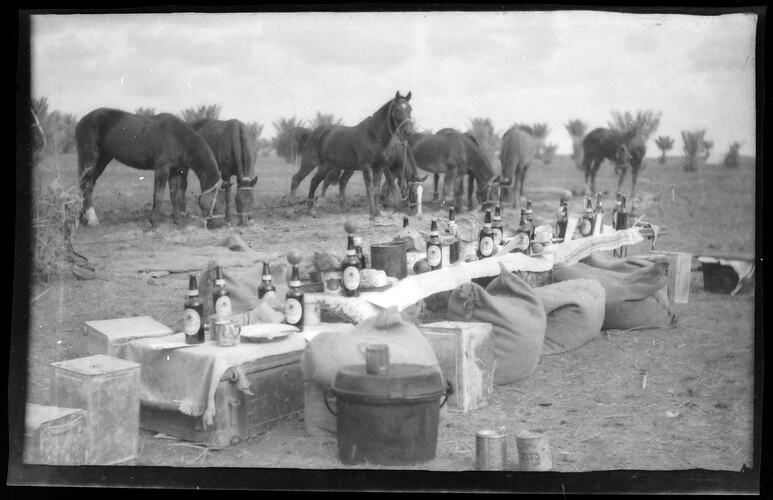 Row of horses grazing in the desert. In front of them is a make shift table, on which numerous bottles rest, with crates and bags as seats.
