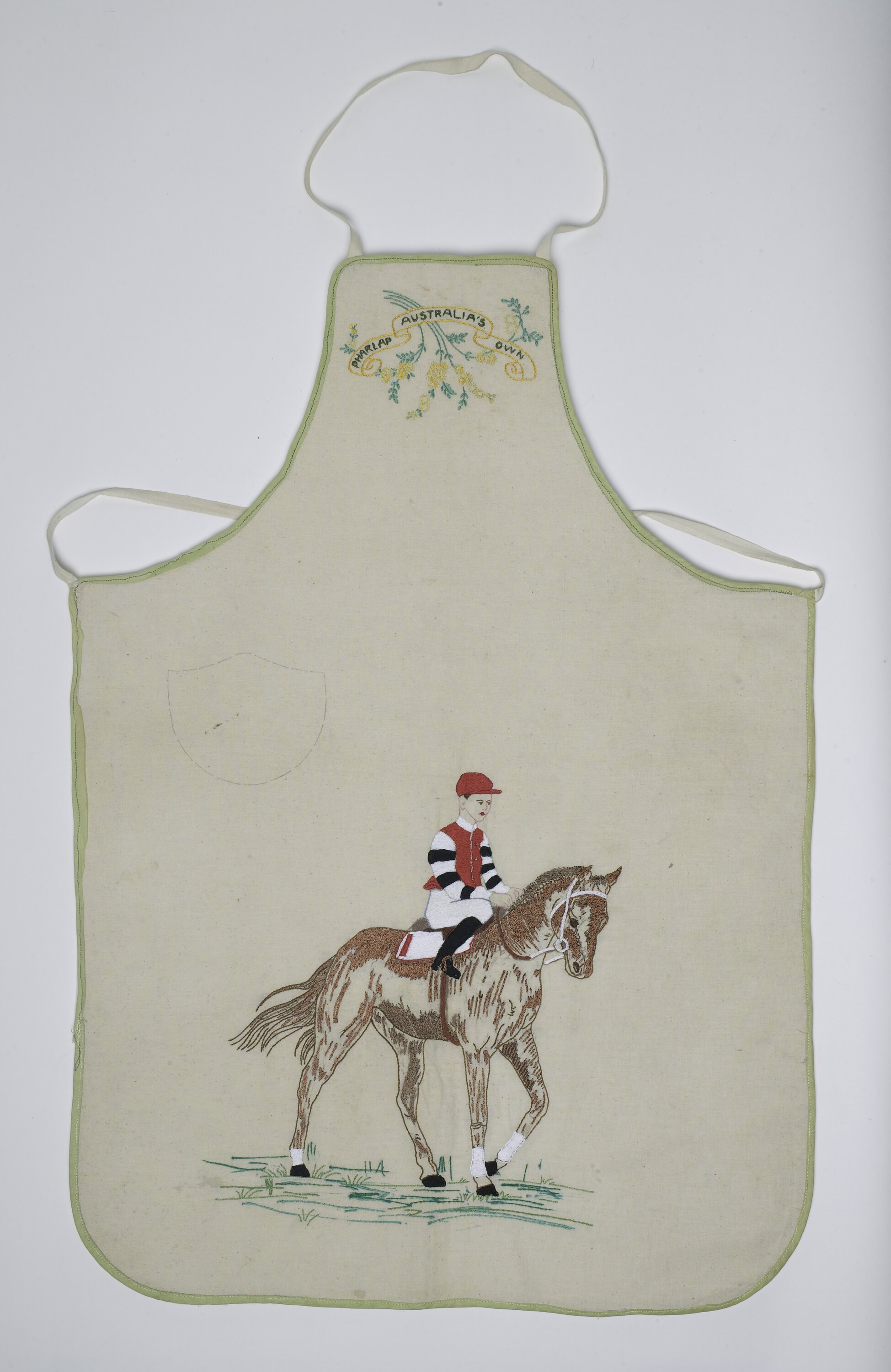 Natural linen apron with light green edging and cotton straps. At top there is wattle embroidered in green and yellow with an embroidered ribbon design and the inscription: "PHARLAP AUSTRALIA'S OWN". At bottom there is an embroidery of a jockey in red, white and black silks riding a brown horse with 3 white socks. There is the outline of a pocket printed on the top left hand side which has not been embroidered.